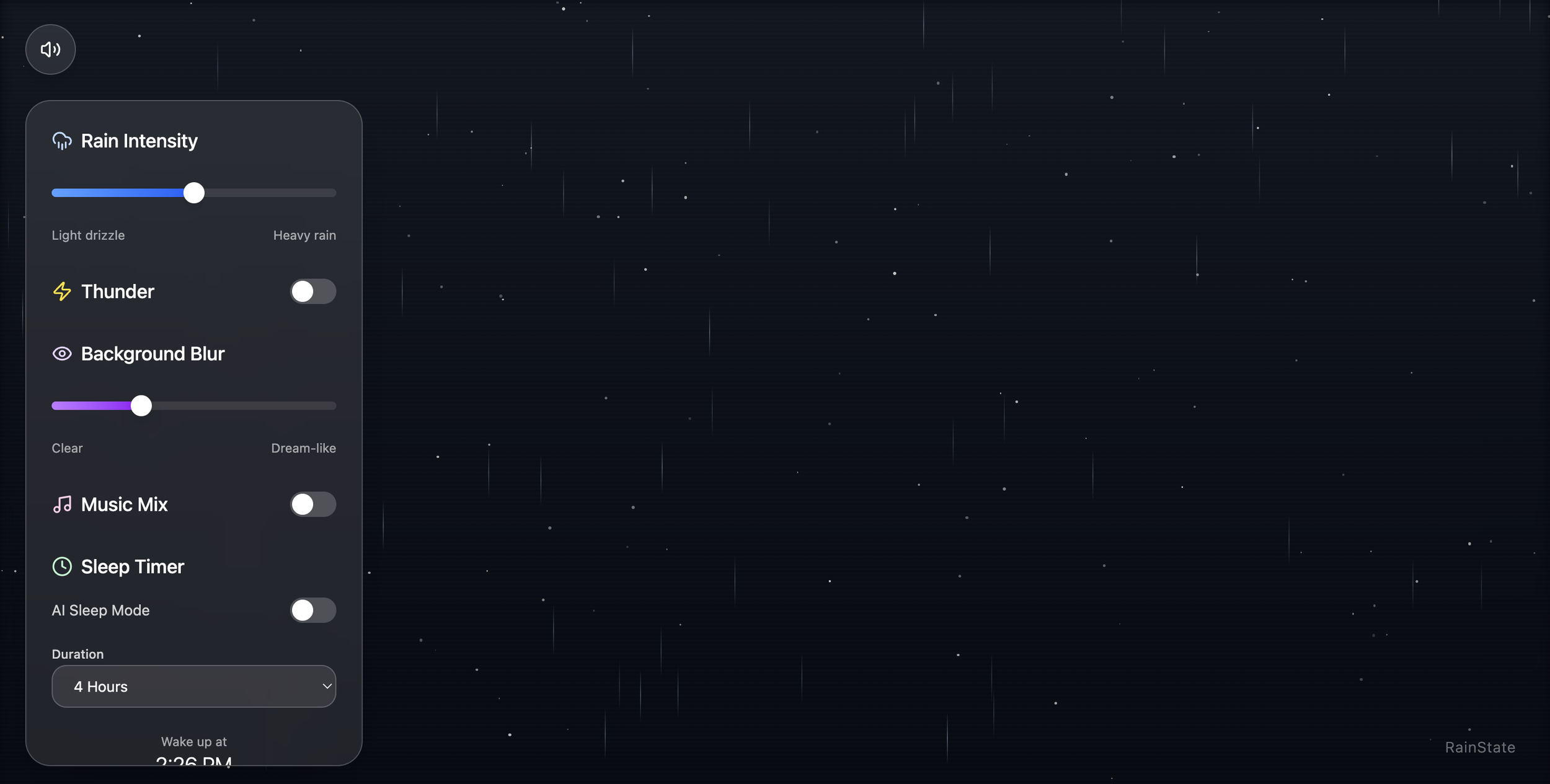 RainState is a single-page immersive rain experience that begins the moment you open it, soft rainfall, deep atmosphere, and a calming cinematic mood. Users can toggle thunder for occasional lightning flashes with subtle Gaussian blur pulses, adding depth and realism. A built-in sleep timer or AI sleep mode gently tracks your rest, projecting your wake-up time while the rain fades out naturally.